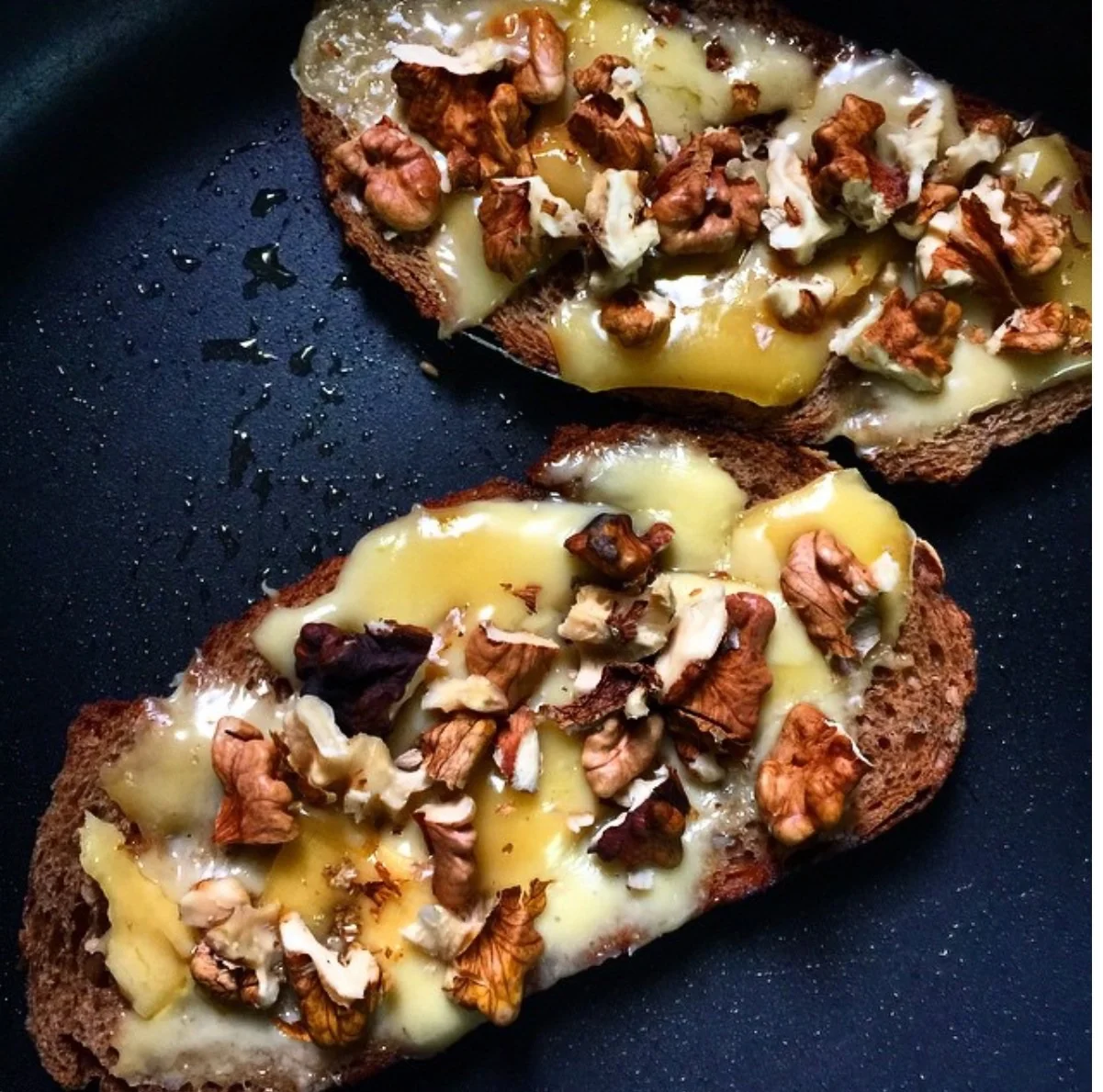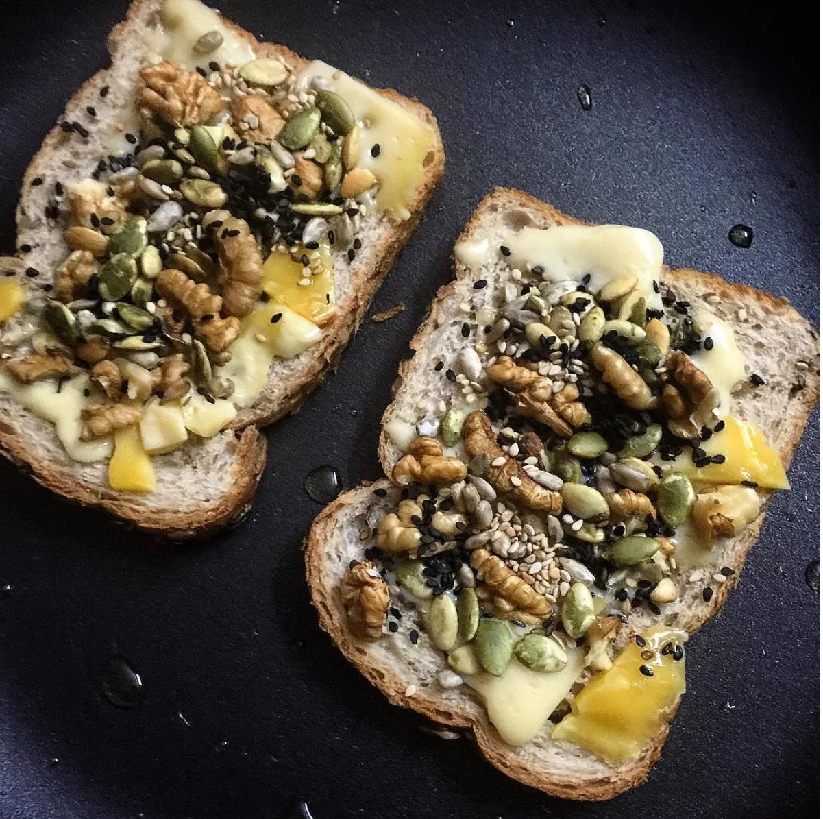 Kinda healthy cheese toast: Sometimes (and only sometimes) a girl just wants comfort food. Make it count. I like to use gourmet cheese (emmenthal and gouda is my fave) on toast, top it up with nuts ore veggies and then place it on a hot pan drizzled with oil. Cover till cheese melts and then eat hot. Even if you’re eating calories, at least they won’t be empty.